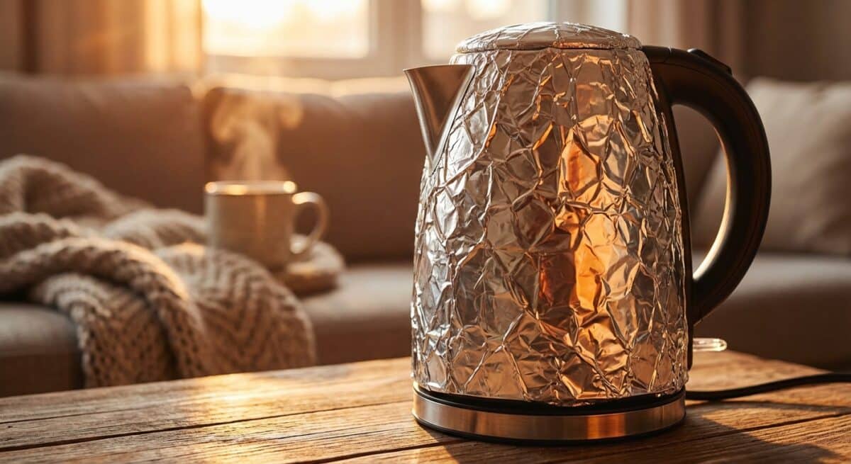 Carta stagnola, bollitore e pluriball lavorano insieme come una piccola orchestra termica. Il metallo riflette il calore, l’acqua bollente libera vapore che avvolge, le bolle trattengono l’aria calda. Effetto immediato: meno dispersione, comfort più alto, consumi giù di colpo.